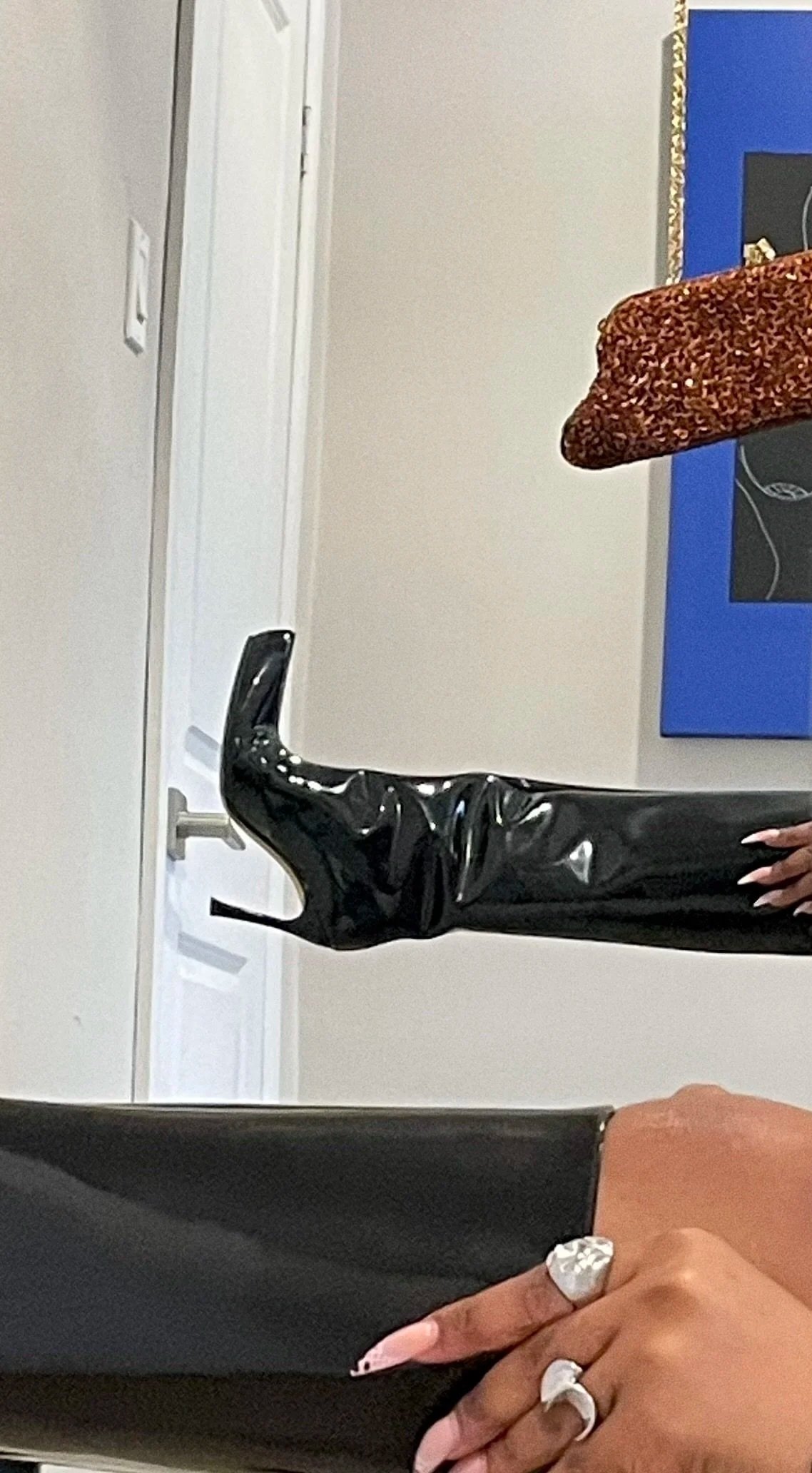 The very collection Zendaya wore when she attended the Vanity Fair Oscars After Party et nearly sliced camera lenses in half with the sharpness of her Gitano jacket. It was a collection for the hotties whether they were Megan fans or not: red leather scoop gloves, elongated satin clutches, no pants looks, leather ties, et the patent knee-high Notizia boot. A high gloss finish, with buffed lambskin lining, et the kind of slightly upward curved pointed toe that makes you go “ah, that’s what the love child of a kinky boot et a cowboy boot would look like.”