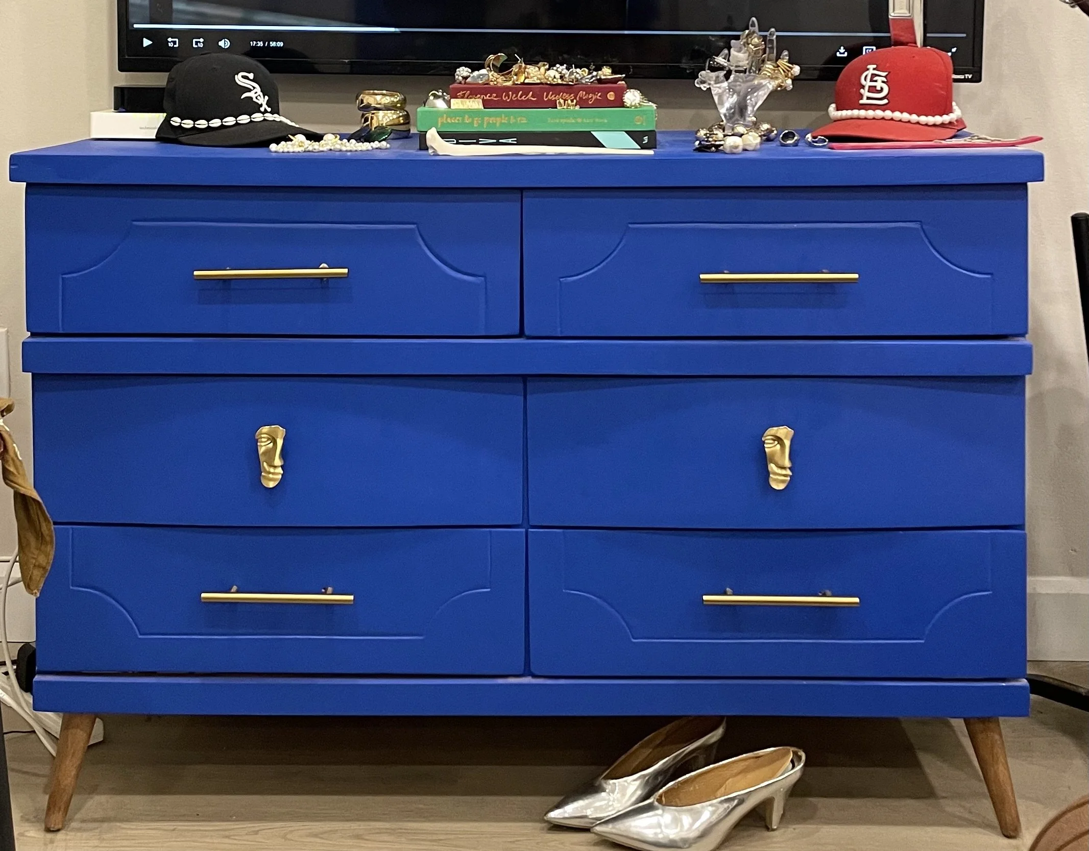 After the breakup, it was one of only two pieces of furniture I moved with, et that’s when I painted it cobalt blue et gave it new handles again. Some things don’t stay the same, but they stay. My jewellery lives on it now. A conversation starter for almost everyone who visits for the first time, et also the only real choice I had when it came to finding space for all my jewellery. You tell me what a diva’s to do when there are no shelves or space for shelves?