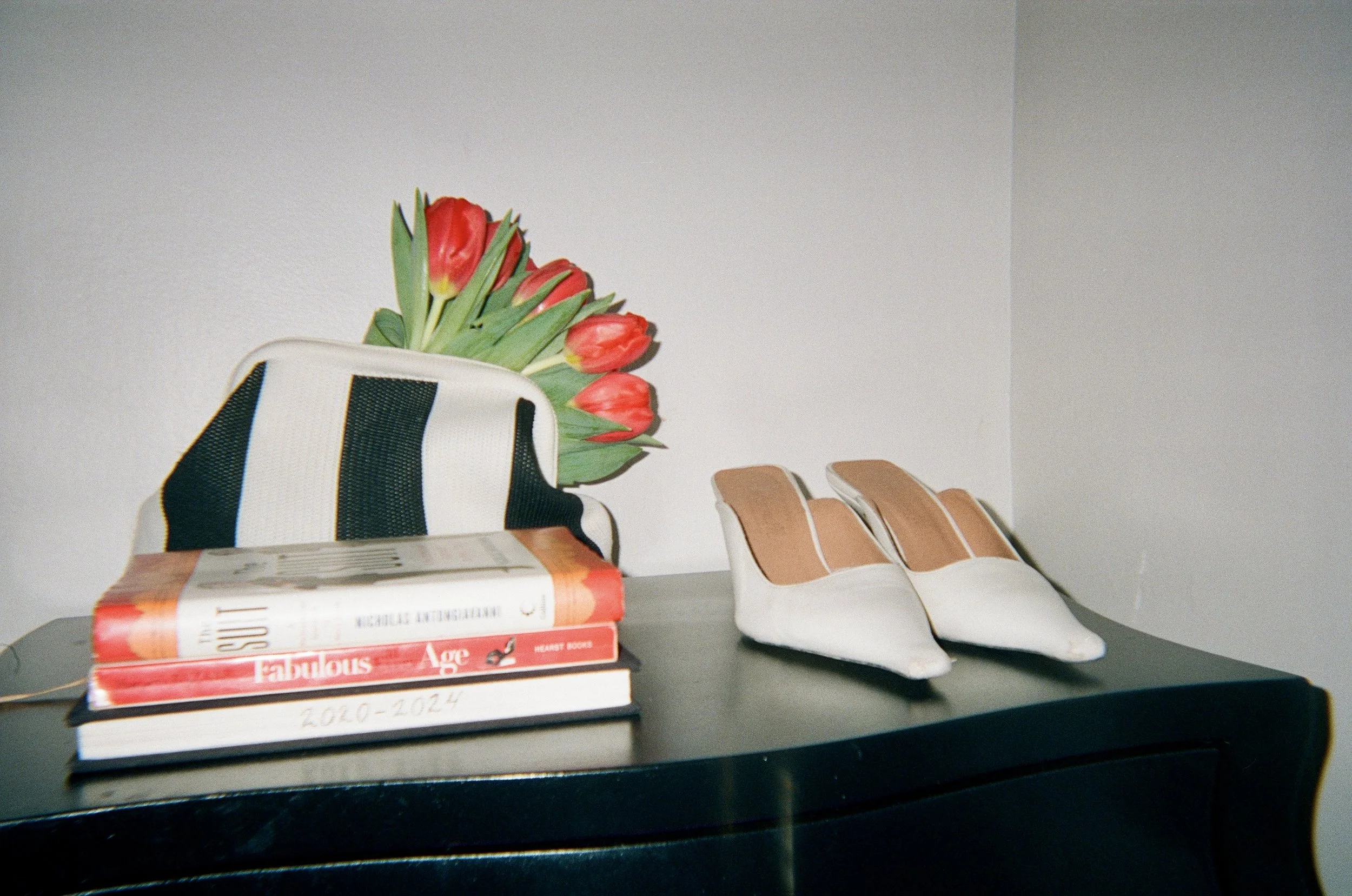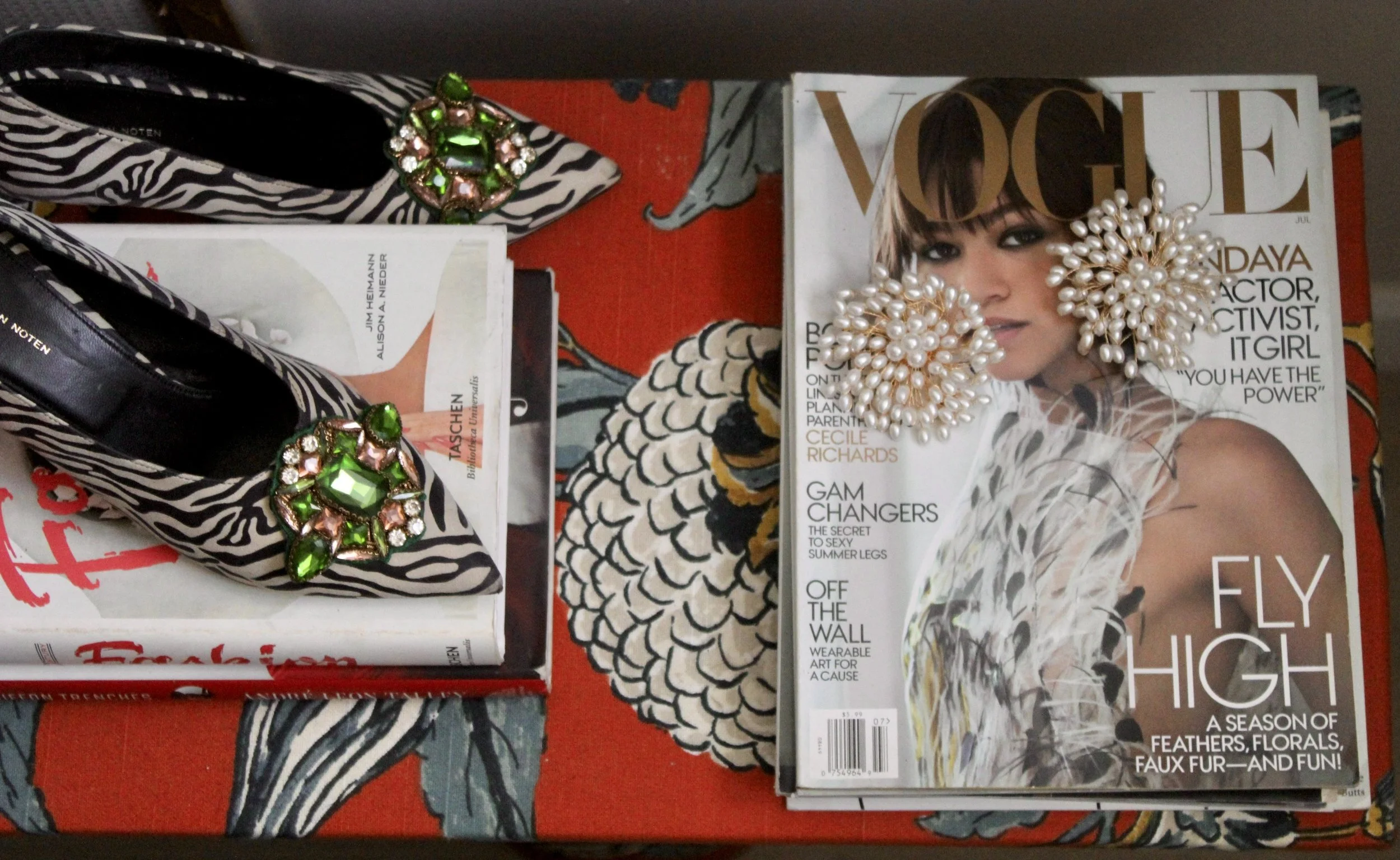 Something about the Prada Spring 2017 feather-trimmed tank hanging from a gallery wall of family photos set my heart ablaze, not any less striking than the emerald Manolo Blahnik Hangisimu anchored on a gilded dish drying rack or the polka dot platforms perched on a stack of magazines.